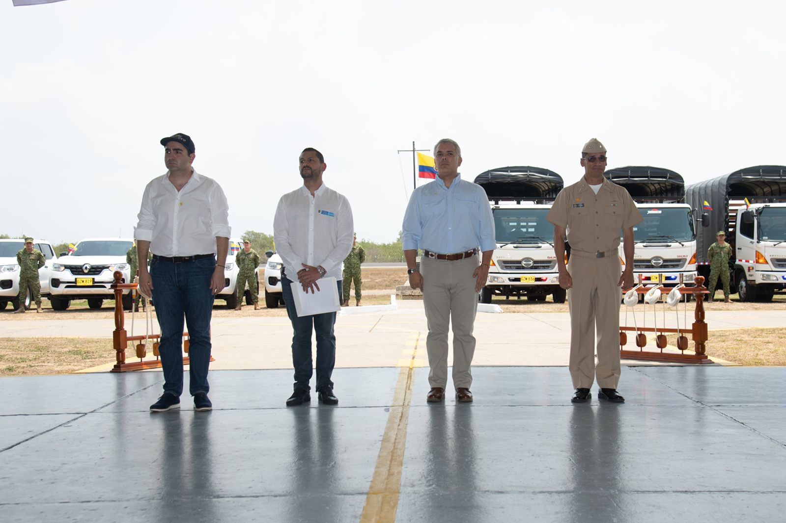 En la ceremonia, el Presidente Duque, 25 vehículos por un costo total de $4.073 millones, que se distribuyen en 13 camionetas Renault Alaskan doble cabina; 10 camiones Hino FC9J light y 2 microbuses Renault Nuevo Master.