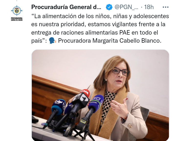«La alimentación de los niños, niñas y adolescentes es nuestra prioridad, estamos vigilantes frente a la entrega de raciones alimentarias PAE en todo el país”, señala a través de la cuenta de Twitter de la entidad, Margarita Cabello Blanco, Procuradora general.