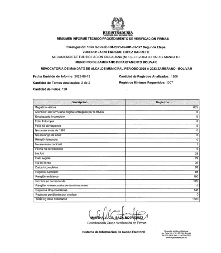 Desde la Registraduría se explica que en el informe técnico de fecha 13 de junio de 2022, realizado dentro del procedimiento de verificación de firmas, radicado bajo el RM- 2021-09-001-05-127, 2a etapa, se analizaron 1800 registros, de los cuales resultaron válidos 885 registros, cuando se requieren para continuar el proceso un mínimo de 1007 registros ó firmas.